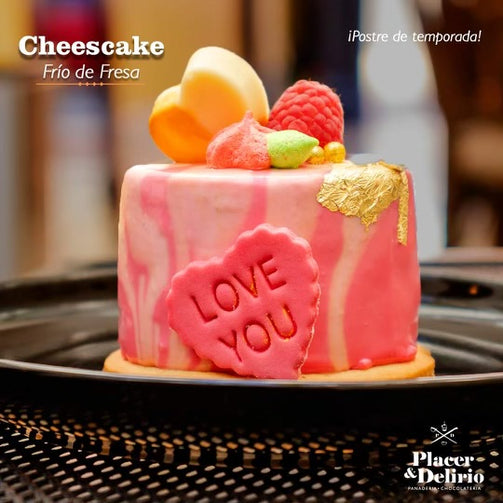 Postre elaborado a base de nata montada con queso crema, yogurt natural, puré de fresa natural y grenetina. Con un glaseado de chocolate con leche, galleta de mantequilla con cocoa en la base y decorado con frutos rojos y bombón de chocolate.