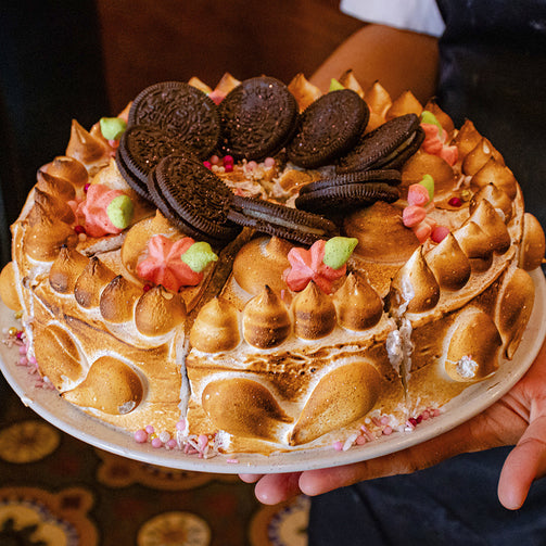 Pastel para 15/20 personas elaborado a base de bizcocho de vainilla, relleno con una crema de cookies and cream, bañado en tres leches y cubierto de merengue suizo.