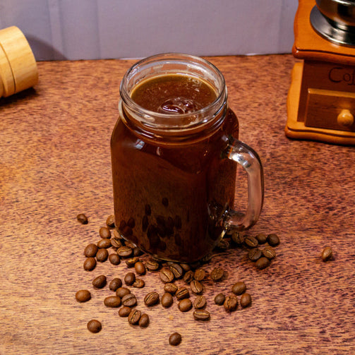 Doble shot de espresso mezclado con agua y hielos . Café en grano, mezcla de Chiapas y Veracruz con un tostado obscuro, molido al momento.