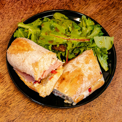 Pan especial preparado con masa madre, relleno con jamón de pechuga de pavo, champiñones, pimientos, queso Oaxaca y base de mayonesa.