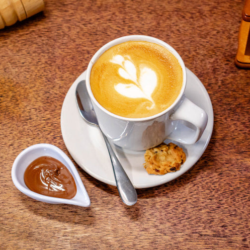 Shot de café espresso (mezcla de Chiapas y Veracruz con un tostado obscuro, molido al momento), mezclado con crema de avellana y leche acremada.