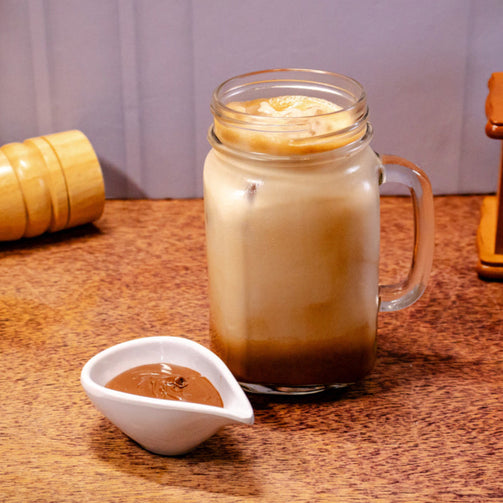 Shot de espresso (mezcla de Chiapas y Veracruz con un tostado medio) mezclado con crema de avellana y endulzante de su preferencia, posteriormente mezclado con hielo y sobrepuesto con leche.