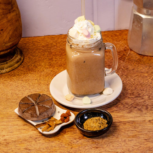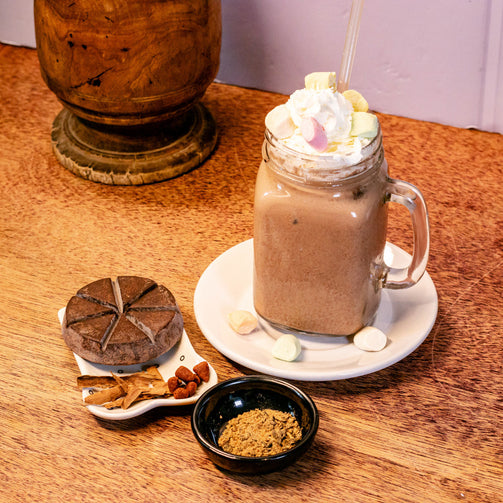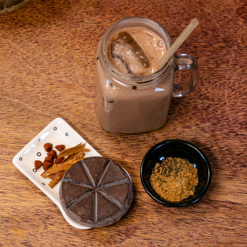 Chocolate puro mezclado con especias(canela, romero, anís, clavo, pimienta Tabasco, chile de árbol, vainilla, almendras y achiote) posteriormente licuado con pasta de trufa, azúcar.