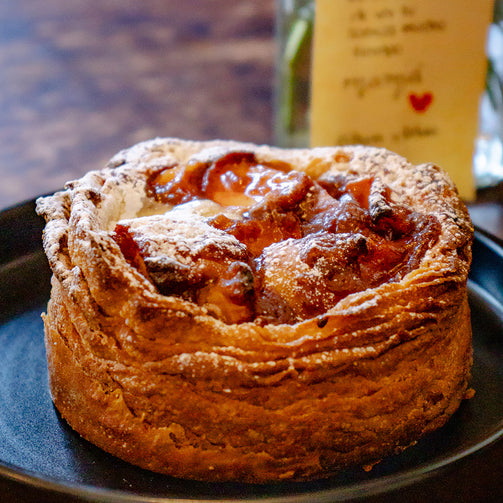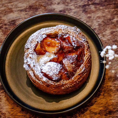 Masa tradicional de pan danés, con un relleno manzana caramelizada y crema de almendras.