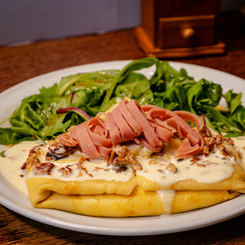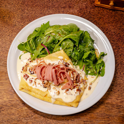 Crepa elaborada al momento rellena de jamón de pavo, queso fundido y crema de tocino.
