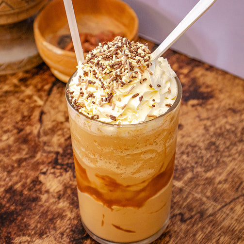 Mezcla especial de café(receta de la casa) licuada con hielos, cajeta, endulzante de su preferencia y leche.