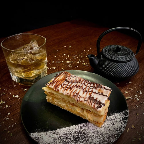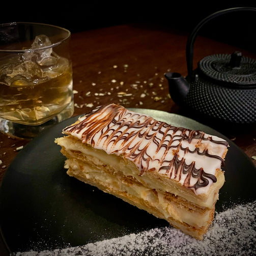 Placas de masa hojaldrada, sobrepuestas con crema pastelera, foundant suave y chocolate.