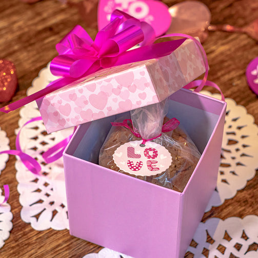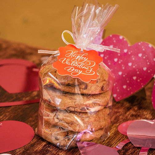 Nuestra receta tradicional de galleta de mantequilla mezclada con chispas de chocolate semi amargo. En una presentación especial para un regalo.