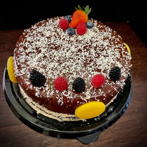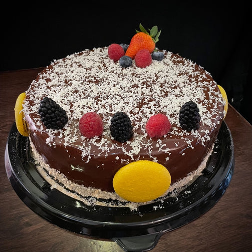 Pastel para 15/20 personas elaborado a base de nubes de chocolate obscuro, chocolate con leche y chocolate blanco, con un toque de crema de naranja y glaseado de chocolate.