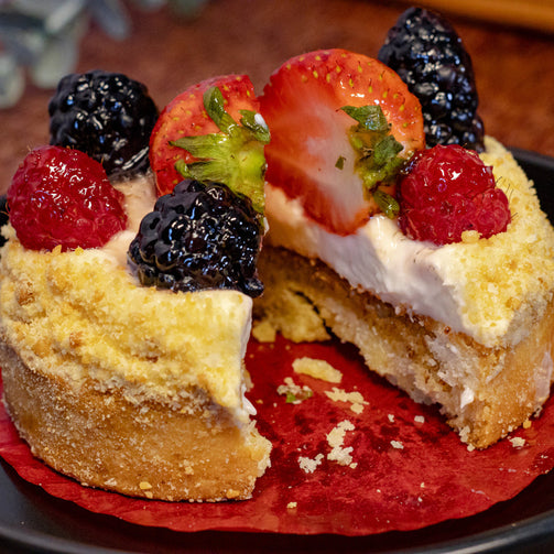 Postre individual elaborado con una base de galleta, rellena con crema de almendra; queso crema y decorado con fruta de temporada.