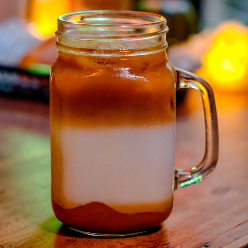 Puré de calabaza hecho en casa, mezclado con especias (canela, clavo, cardamomo, jengibre y nuez moscada), un shot de café espresso, leche y hielos.